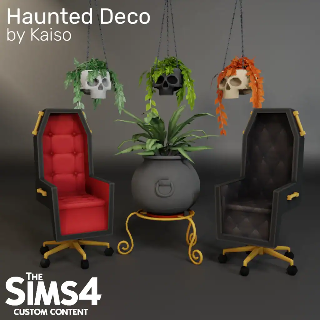 Kaiso’s Haunted Deco set is a mini pack with creepy and chic furniture and decorative pieces for Halloween. These include two coffin-shaped office chairs, a bubbling cauldron planter, and hanging skull planters with leafy vines in autumn and green swatches.