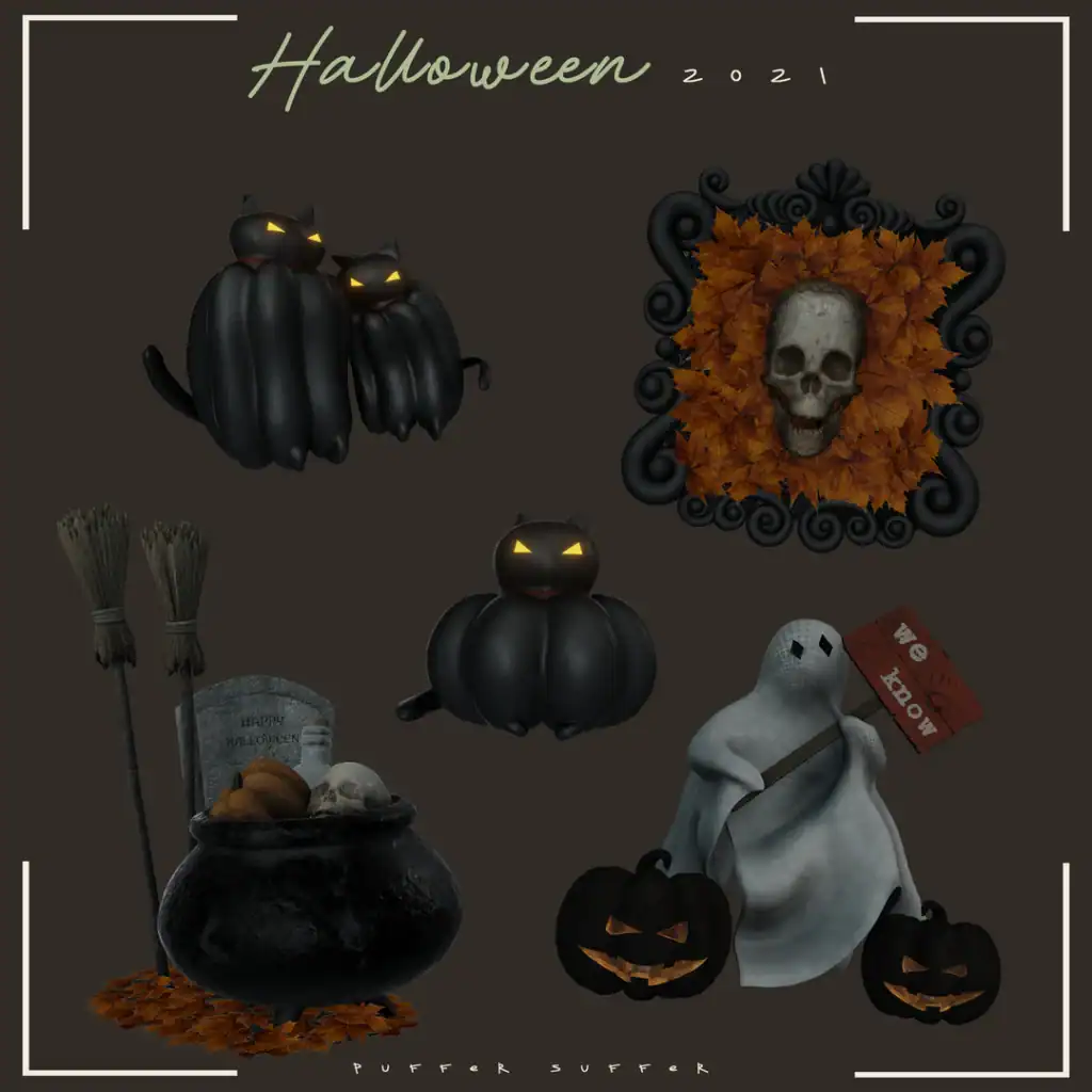 This Halloween CC Pack by PufferSuffer provides five spooky decor objects to transform your Sim’s home for the season. Each piece is base-game compatible and designed in a Maxis Match style.