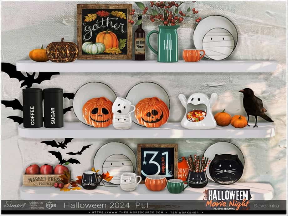 Severinka’s Halloween 2024 Part I set captures the cozy-meets-creepy charm of the spooky season perfectly. It includes pumpkin and ghost-themed plates, coffee and sugar jars, glowing jack-o’-lanterns, and rustic “Gather” art prints to warm up your shelves.