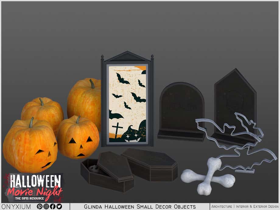 Created by Onyxium, the Glinda Halloween Small Decor Objects pack is a must-have in 2025. It’s perfect for adding spooky details to your Halloween scenes, and it contains carved pumpkins, mini coffins, tombstones, bone props, and a framed bat poster.