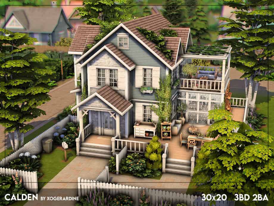 Calden House is a charming cottage-style lot with a welcoming front porch framed by greenery. This build comes with three bedrooms and two bathrooms across two floors. There’s a glass greenhouse sitting along one side of the building where your Sim can garden and grow their own produce.