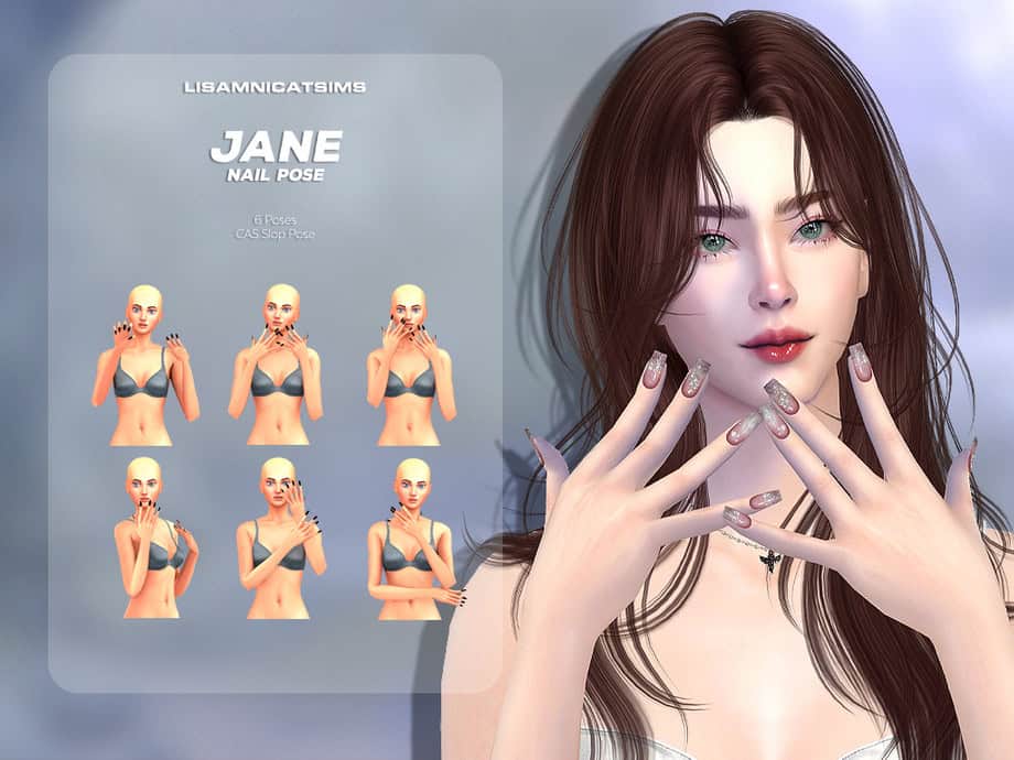 Jane Nail Poses come with six poses in total, all running on CAS using the Slob trait, so you can easily switch between them while editing your Sim. They’re ideal for screenshots, lookbooks, or quick previews of your nail CC.