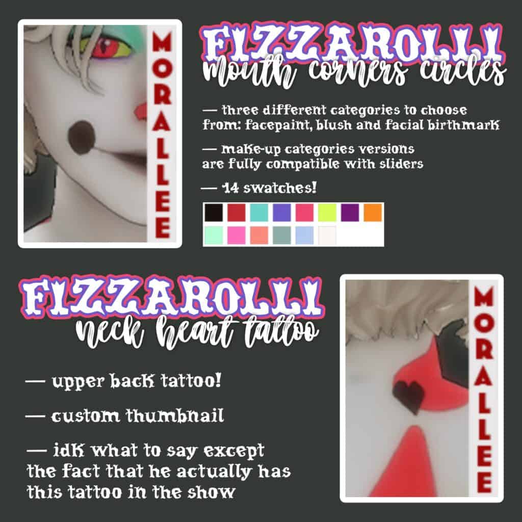 This set also includes mouth corners circles, which come in multiple versions across facepaint, blush, and facial birthmark categories, with 14 swatches each. The corner circles are also compatible with makeup sliders for easy customization.