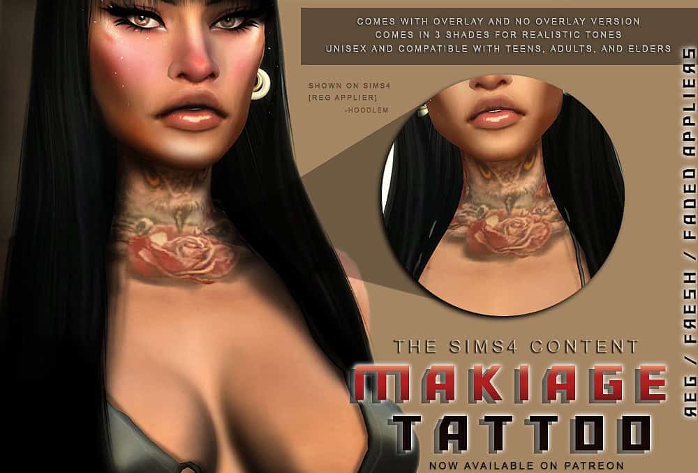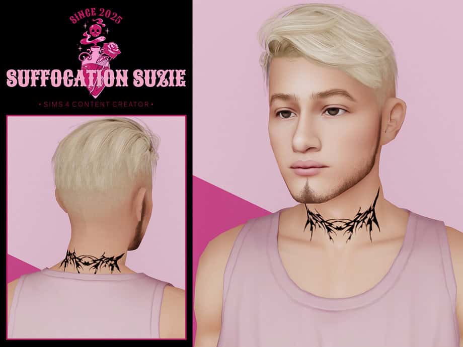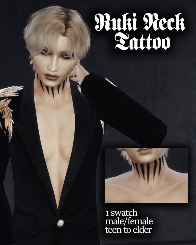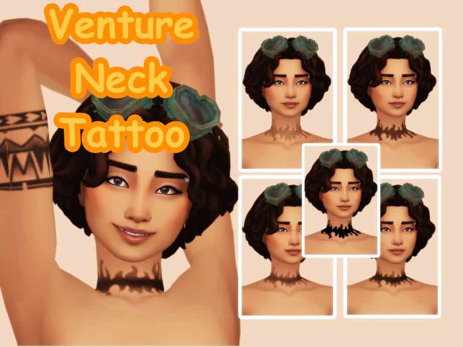 The creator mentions that the tattoo was updated for the Businesses and Hobbies EP patch, and while the texture isn’t compatible with EA sliders, it’s adjusted to work well across most skin tones. This Sims 4 neck tattoo is compatible with the base game, which means you can use it without requiring any additional packs.