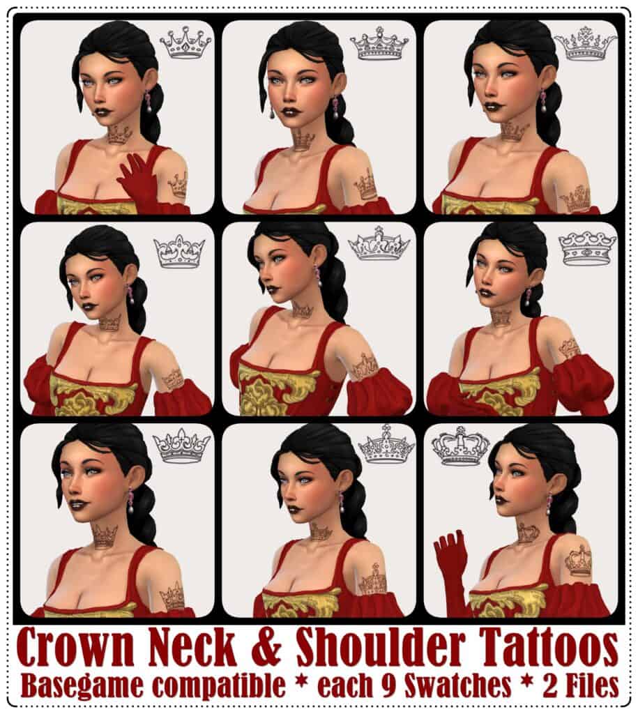 These designs are available in several swatches, including black and bright colors like purple. The placement sits neatly at the nape, making it perfect for updos or short hairstyles. Note that this Sims 4 neck tattoo pack has a low polycount, which means it won’t affect your game’s performance.