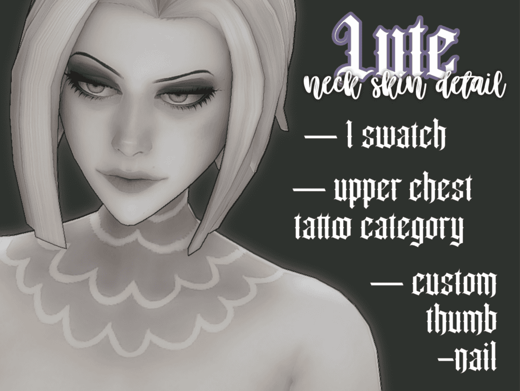 Lute Neck Skin Detail is a soft, decorative neck overlay inspired by the Hazbin Hotel aesthetic. This Sims 4 neck tattoo adds a layered, collar-like pattern around your Sim’s neck and upper chest.
