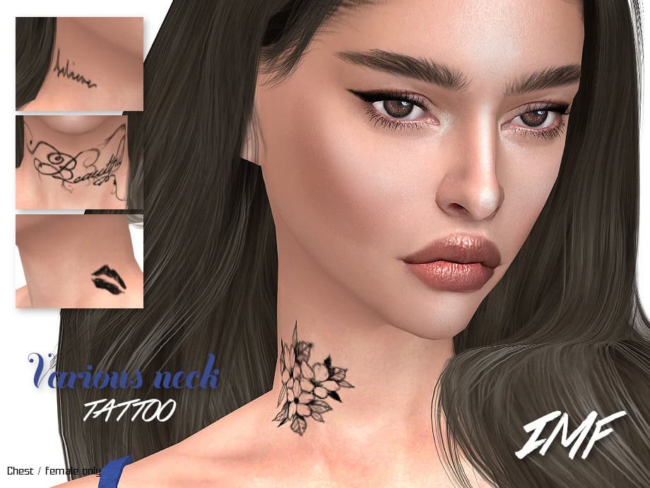 IMF Tattoo Neck Various is a set of delicate neck tattoos placed along the side and front of your Sim’s neck. You’ll get four different designs in one color, including a fine script, floral style, and subtle graphic options.
