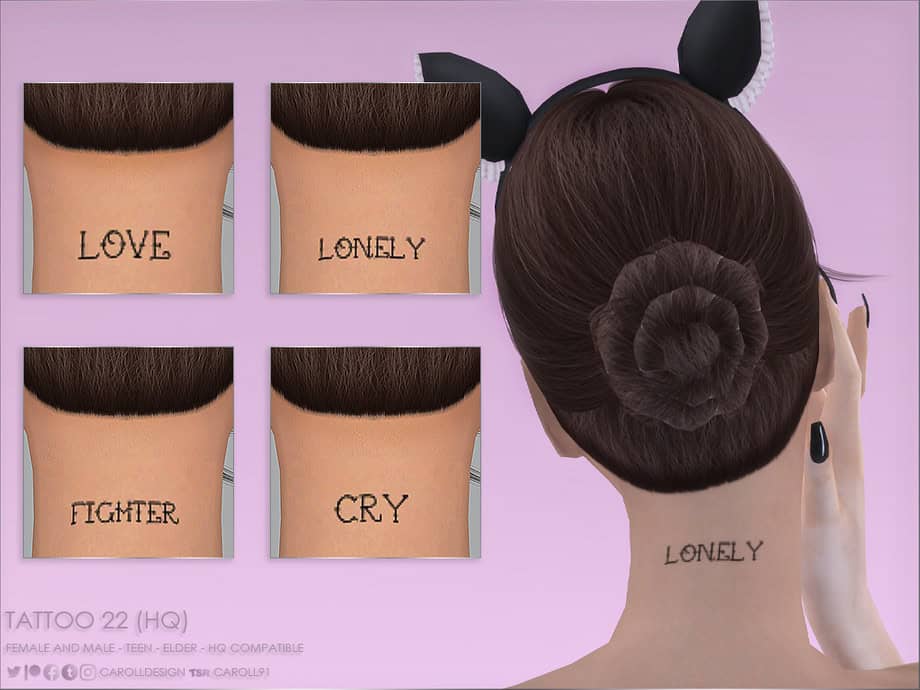 Tattoo 22 is a minimalist typography Sims 4 neck tattoo set with four clean word designs: “LOVE,” “LONELY,” “FIGHTER,” and “CRY”. These gorgeous artworks cover the back of the neck for a subtle but expressive look.