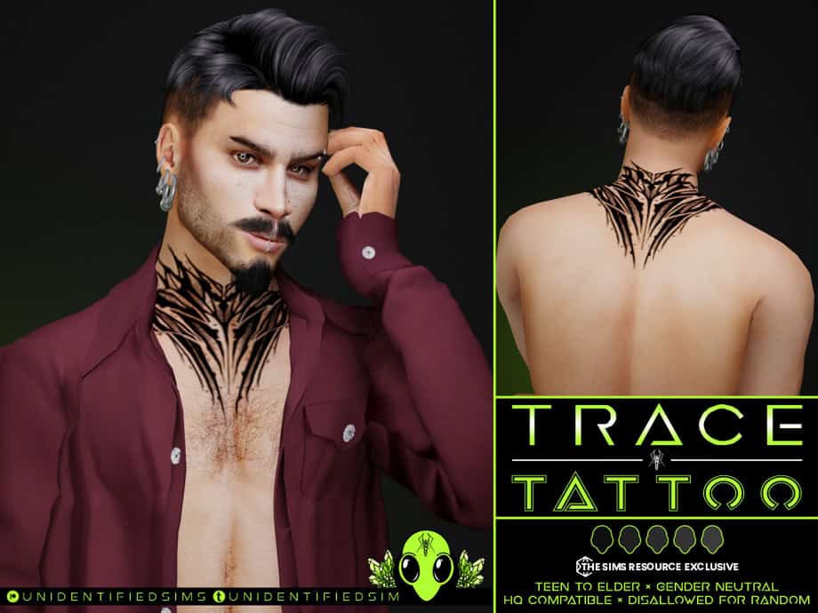 If you’re looking for a bold neck tattoo that instantly stands out, check out the Trace Tattoo. It’s a sharp, tribal-inspired design wrapping from the neck down toward the upper chest and back. This design gives your Sim a strong, edgy look.