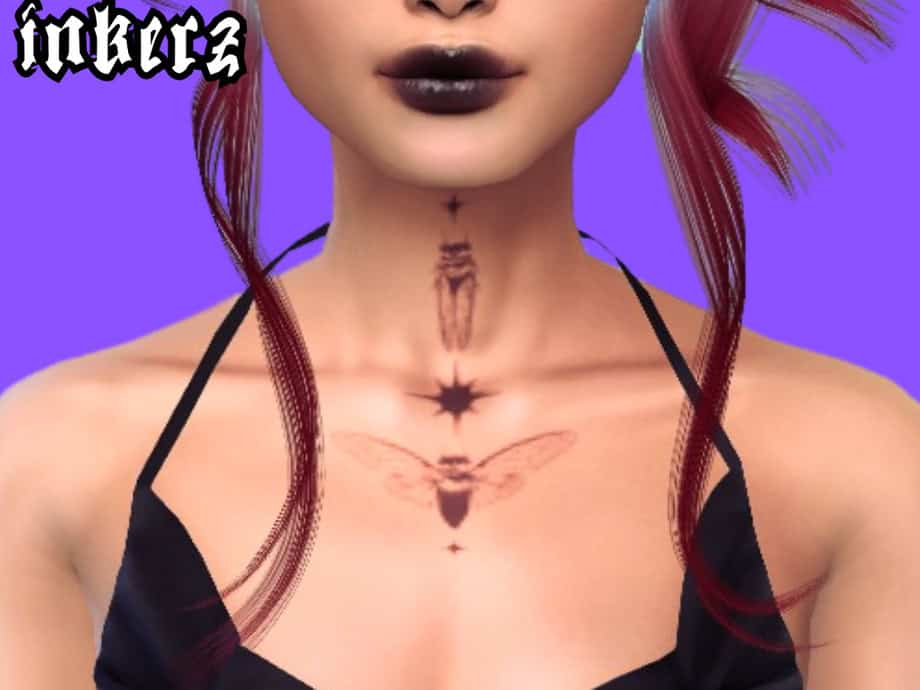 Neck Bug Tattoo is a bug-inspired piece designed for the base game. The tattoo covers the front part of the neck in a straight line. This Sims 4 neck tattoo is designed for female Sims.