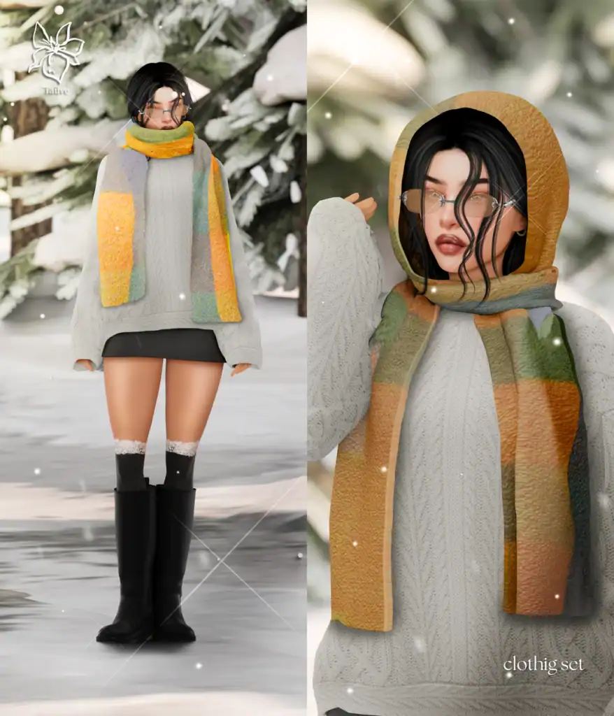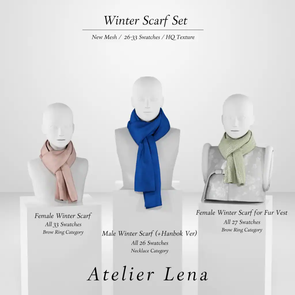 The Winter Scarf Set by Atelier Lena is a clean, minimalist collection of cold-weather accessories designed to blend seamlessly into everyday Sim wardrobes. This set includes: