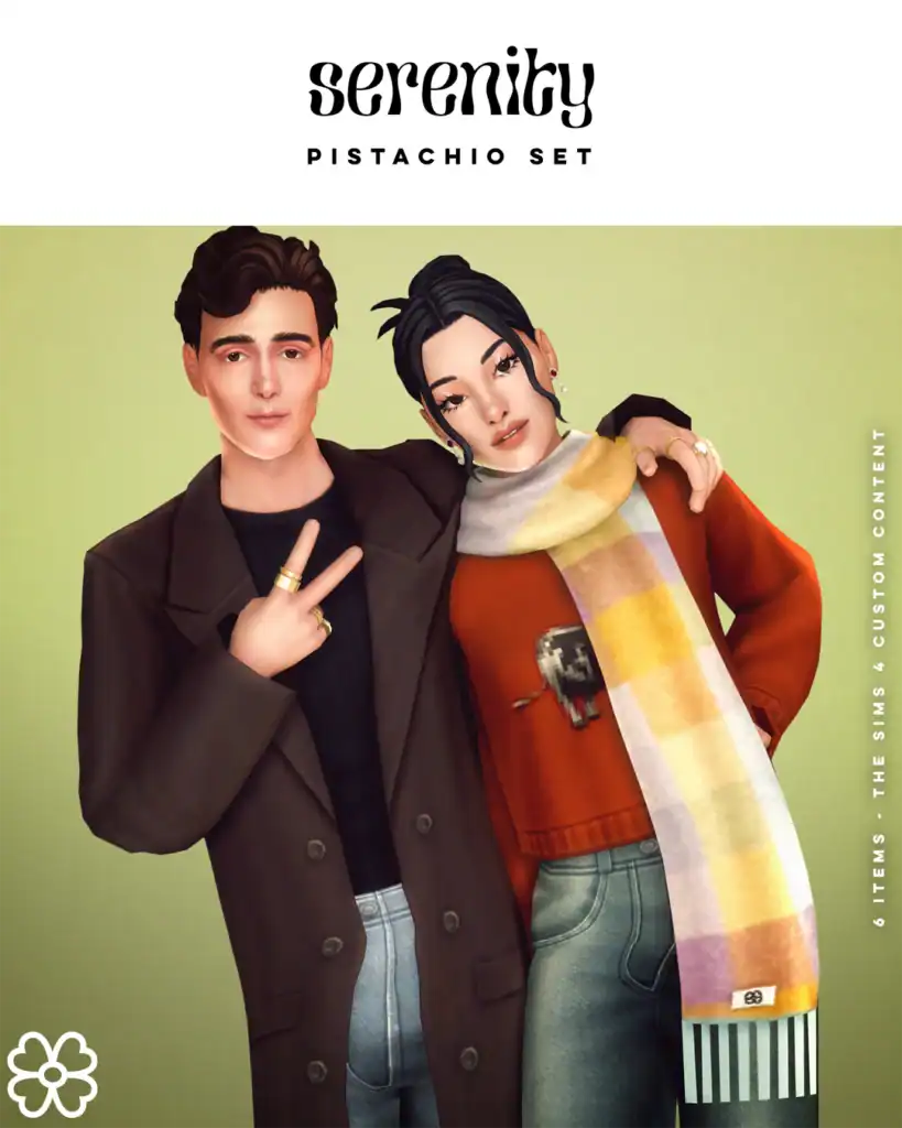 The Soft Scarf Season Collection brings together cozy, layered outfits with soft, wearable scarves for both feminine and masculine Sims. For feminine frames, you’ll get 3 scarf-layered pieces, including: