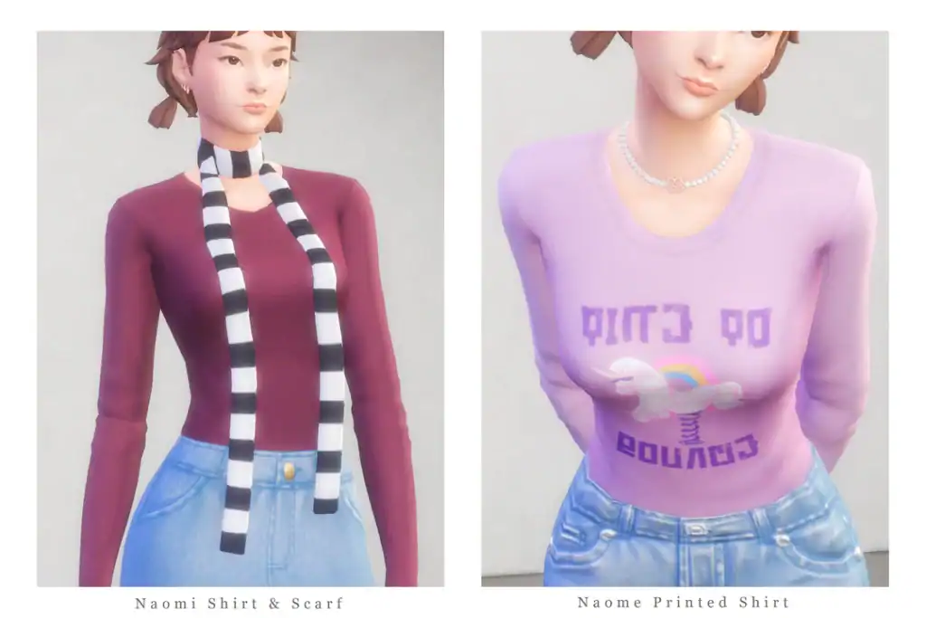 I’d pair it with off-shoulder tops, knit sweaters, cropped jackets, and casual everyday looks. Note that the Sims 4 scarf cc is categorized in the glasses section, making it easy to layer with most outfits.
