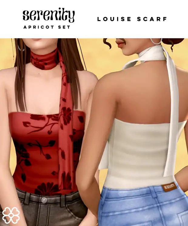 Designed as a lightweight neck accessory, this scarf pairs naturally with camis, fitted tops, and dresses from the set. You’ll find it in the necklace category in CAS. Click on the attached link for more information on this Sims 4 scarf cc.