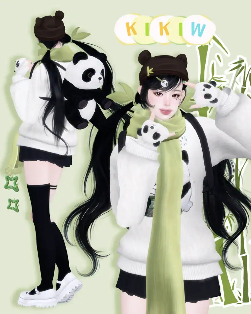 The Kikiw Studio Panda Scarf is a playful, oversized accessory ideal for completing cozy, character-inspired outfits. This long accessory drapes loosely around the neck and flows well past the waist with a soft knit look. It comes in multiple color swatches, including soft greens, pink, white, orange, and blue.