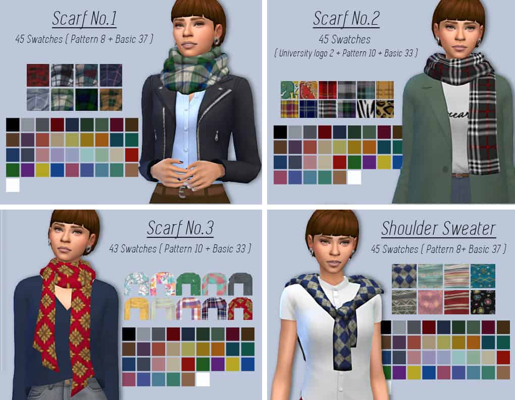 Scarf CC often comes with multiple swatches, ranging from simple solid colors to patterns like stripes, plaids, or seasonal designs.