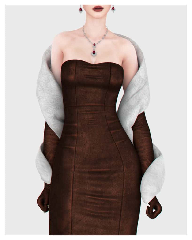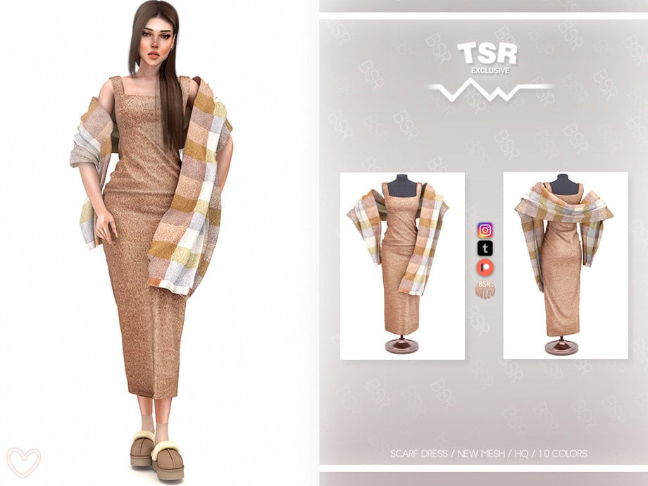The Scarf Dress is unlike any other Sims 4 cc scarf on this list. Instead of a simple scarf accessory, you get an outfit and a scarf in one. The sleek midi dress is paired with a draped scarf detail worn effortlessly over the shoulders. The structured silhouette makes it perfect for refined everyday looks, office outfits, or chic autumn styling.