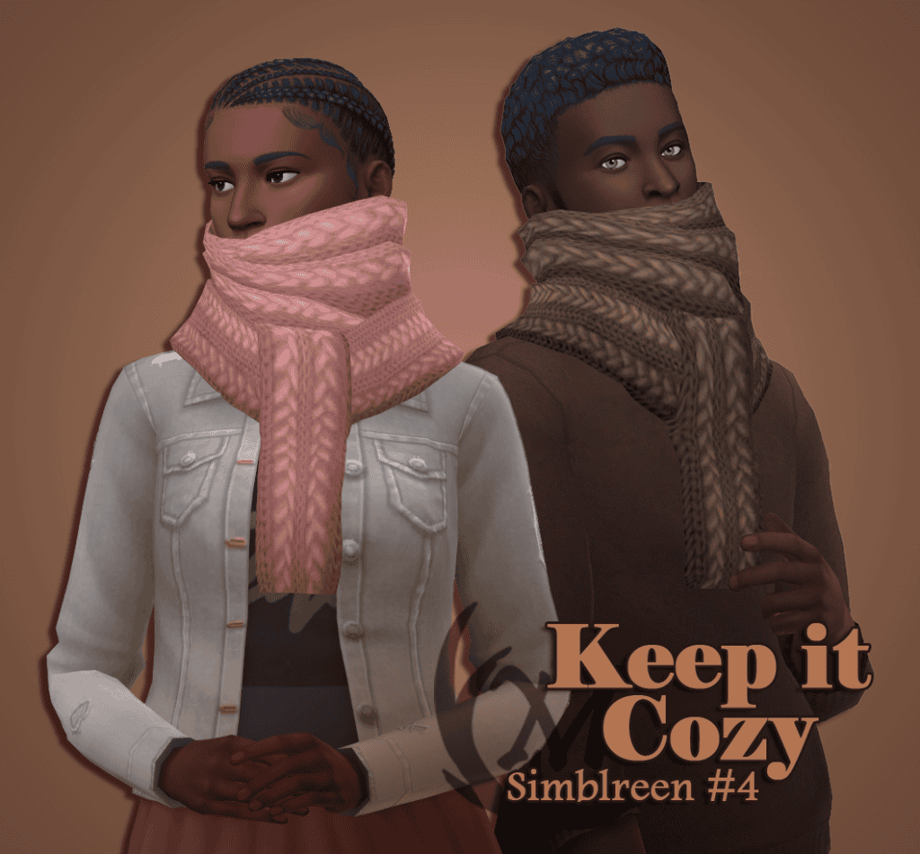 Keep It Cozy Scarf CC is a thick, wrapped scarf designed to add serious warmth and texture to your Sim’s cold-weather outfits. It sits high around the neck and covers your Sim’s mouth. The scarf is available in 28 swatches from the Historian palette, including soft pinks, earthy browns, muted greens, and warm neutrals.