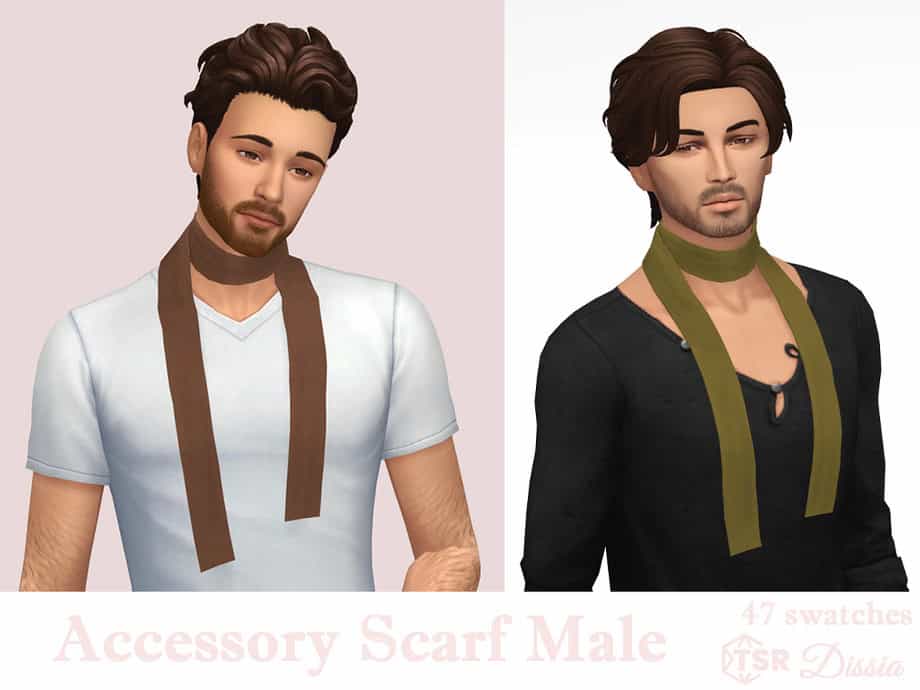 The Accessory Scarf Male is a simple, versatile neck scarf designed to sit neatly wrapped around your Sim’s neck. The scarf is available in 47 swatches, so you get a wide mix of colors for flexible styling.
