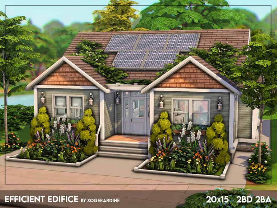 The build sits on a 30×20 lot and has a simple single-story layout. It costs 19,985 Simoleons, keeping it within the true starter range. This home works especially well for eco-focused saves, off-the-grid storytelling, or players who enjoy reducing bills and generating their own power.
