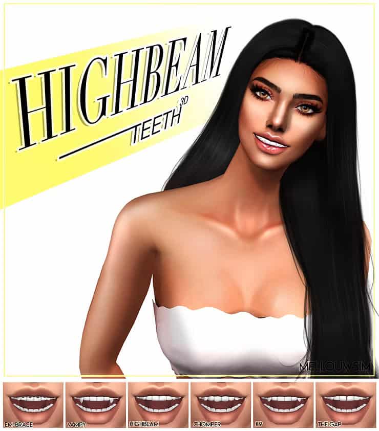 If you’re looking for detailed, high-quality teeth cc to brighten your Sim’s smile, the Highbeam 3D Teeth by MellouwSim is a strong pick. This set includes six distinct 3D styles: Em-Brace, Vampy, Highbeam, Chomper, K9, and The Gap.
