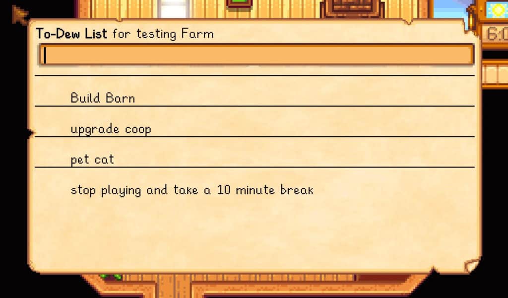 I like using this mod to get a clear overview of what needs to be done each day. The mod integrates seamlessly into gameplay, and you can customize and update your list as you go.