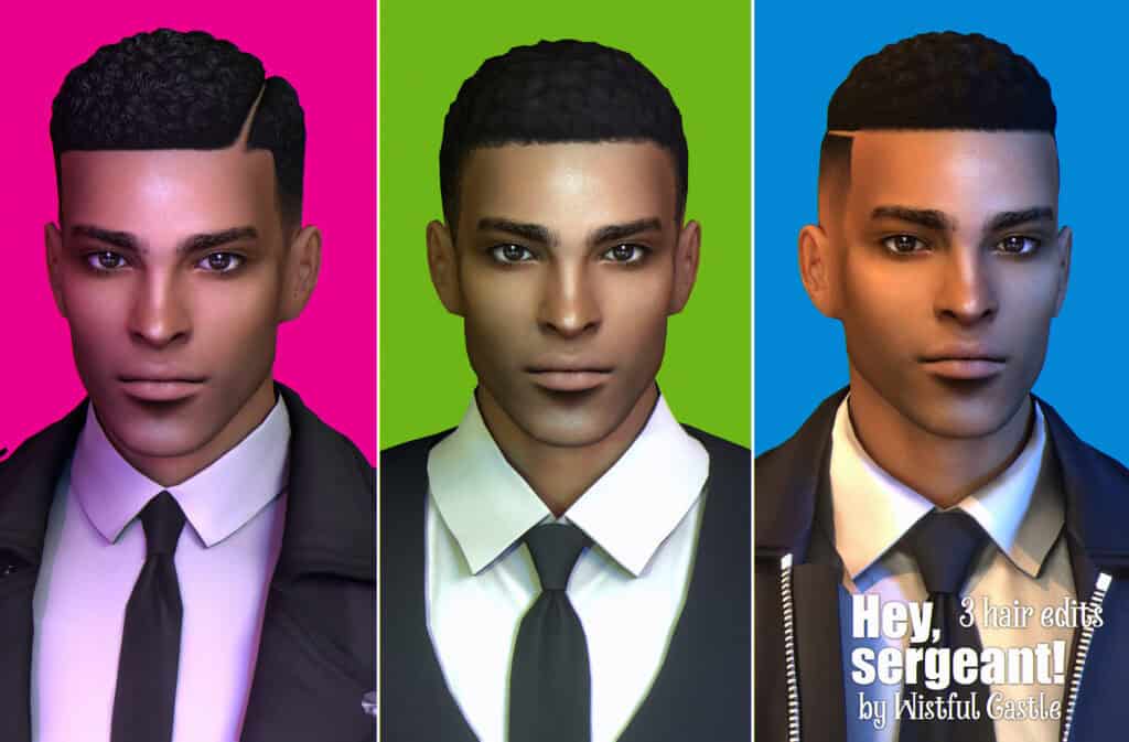 Hey, Sergeant! (3 Hairstyles) is a clean fade hairstyle set with three edited versions of the classic short cut. Each style maintains a sharp lineup with subtle texture differences, giving you flexible everyday options for male Sims.