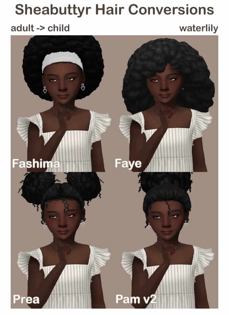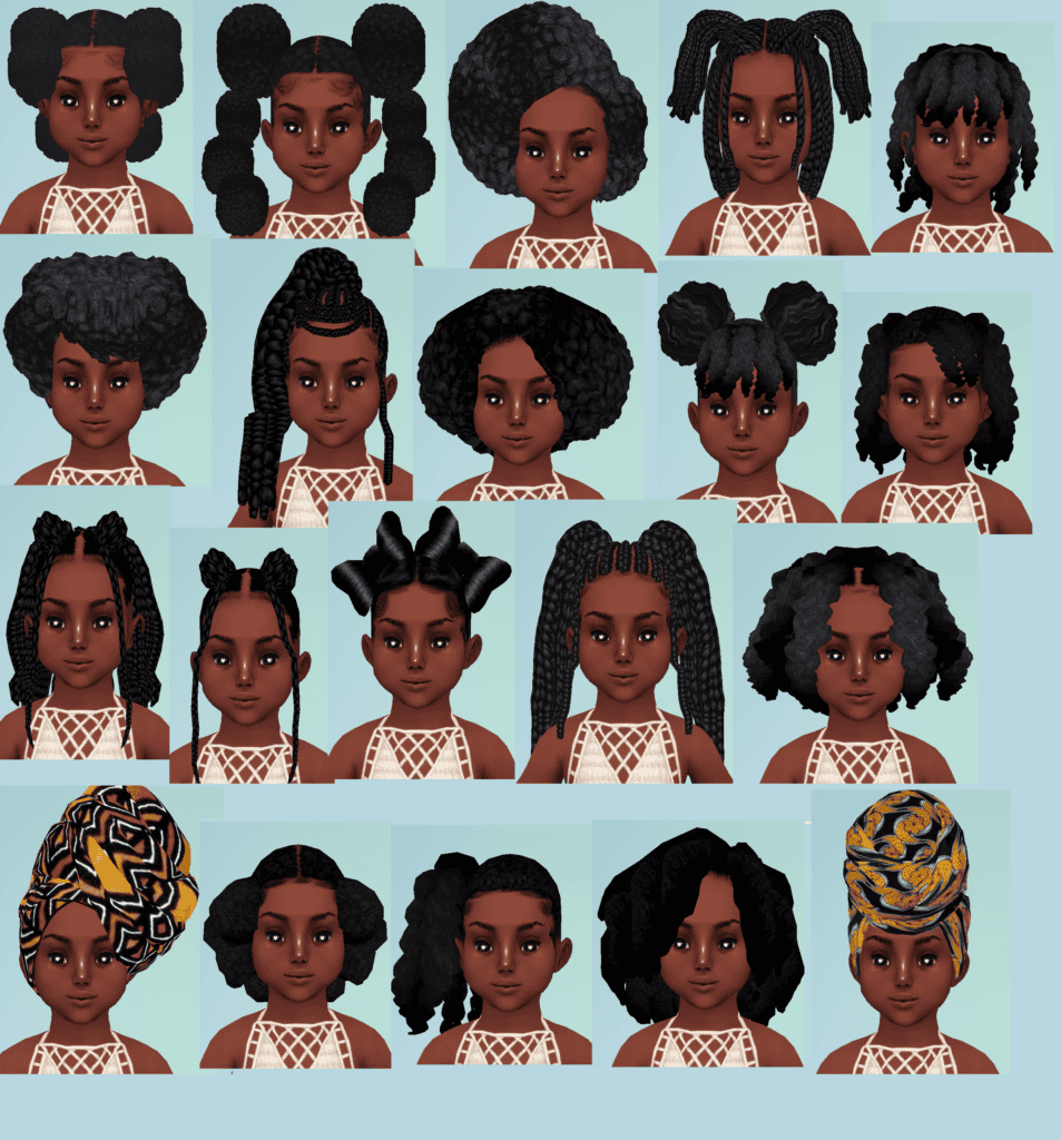 Sheabuttyr Hair Conversions is a child conversion pack with several popular afro styles for younger Sims. The set includes converted versions of: