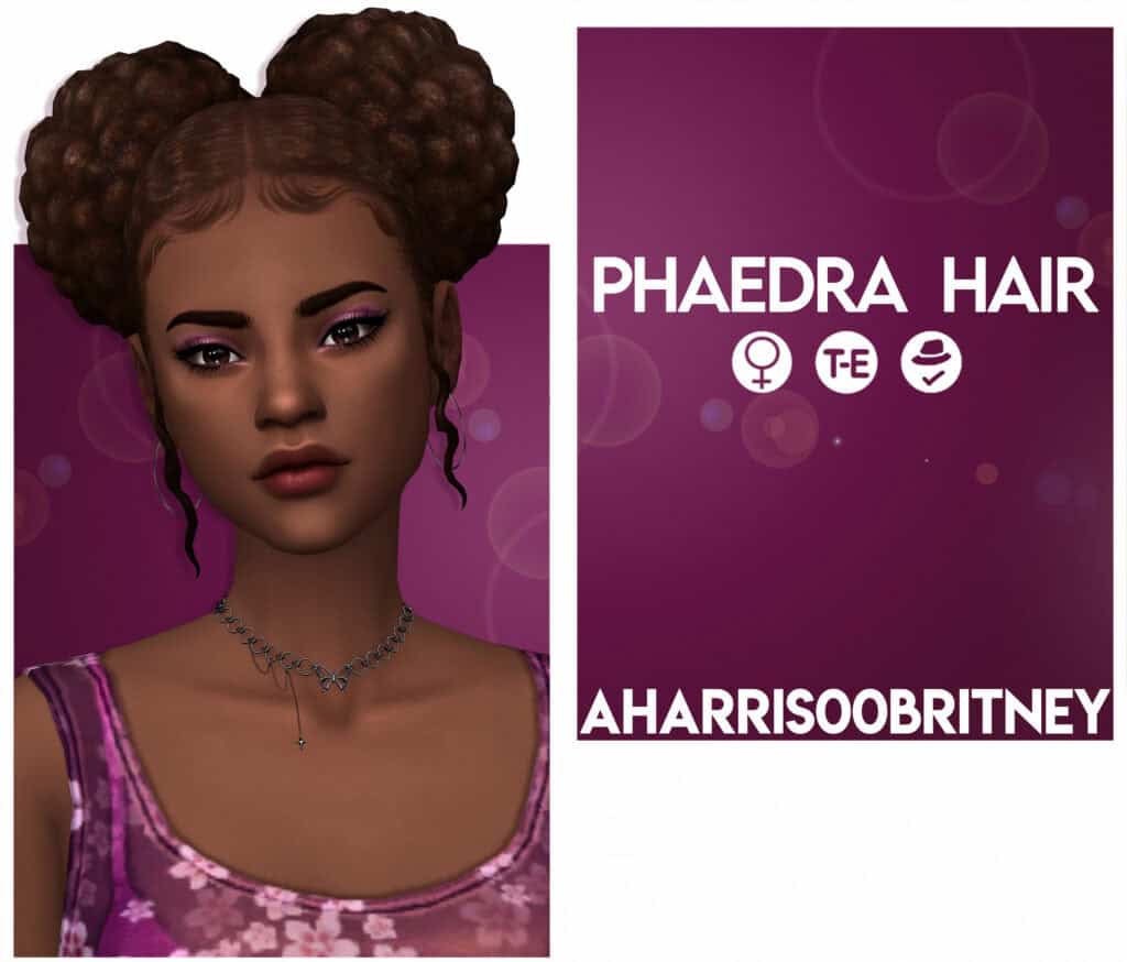 This afro hairstyle features two large, rounded puff sections paired with a high wrapped top bun for a bold, sculptural silhouette. This hairstyle works with hats without clipping issues. It’s also base game compatible and designed for female Sims.