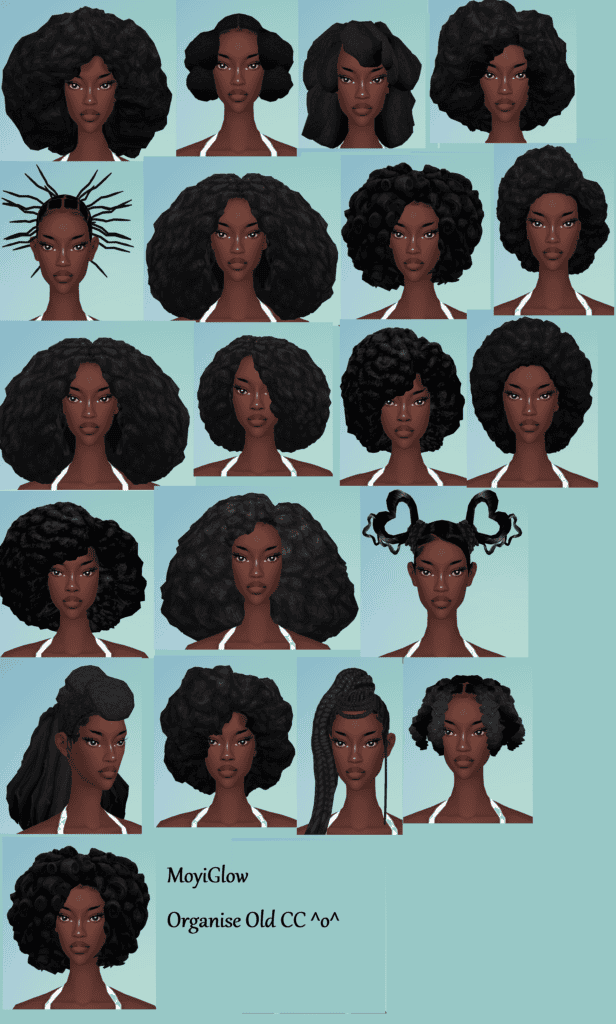 This ethnic collection by MoyiGlow includes multiple maxis match afro styles ranging from short, rounded cuts to full, voluminous shapes and side-swept looks. These options give you noticeable volume variety for your black Sims.