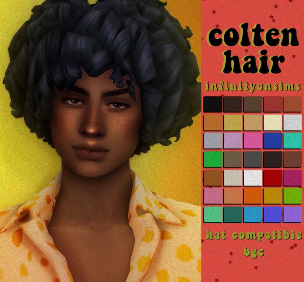 The Jort Hair is a curly afro hairstyle designed by Okruee. The curls are more wavy and loose compared to the other curly fros on this list. The beauty of this afro hair Sims 4 cc is that it works on both male and female frames. It comes in all 24 EA swatches and is base game-compatible and hat-compatible, so you don’t have to worry about getting expansion packs to use the Afro.