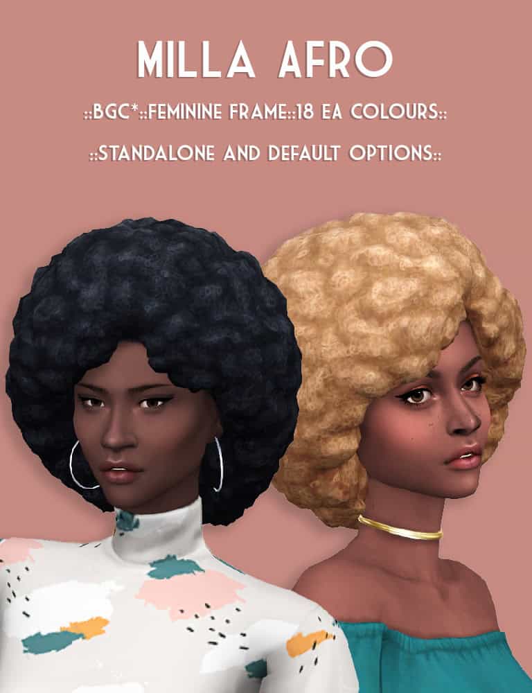 If you’re looking for a fuller EA afro with a slightly more face-framing shape, the Milla Afro is worth adding to your mods folder. This feminine-frame hairstyle comes in 18 EA colors and offers both standalone and default replacement options. This gives you flexibility in CAS.