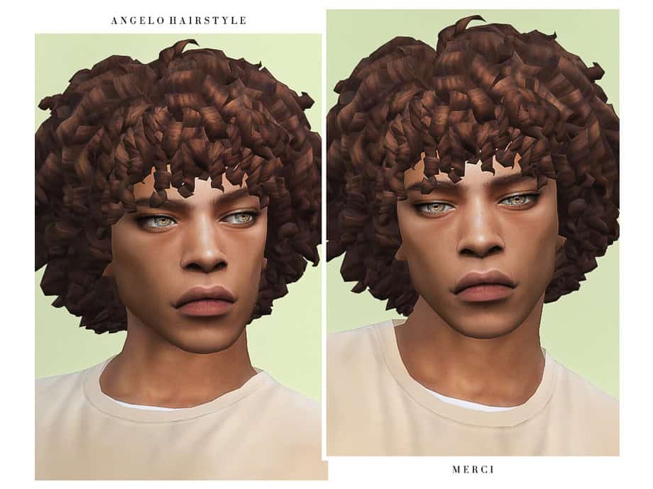 Angelo Hairstyle is a short curly hairstyle with dense, defined coils shaped into a rounded silhouette. The hair comes in 24 EA colors and works with hats. Note that the Sims 4 afro hair has been tested in-game with no visible clipping or texture issues. It’s designed for male Sims from teen to elder.