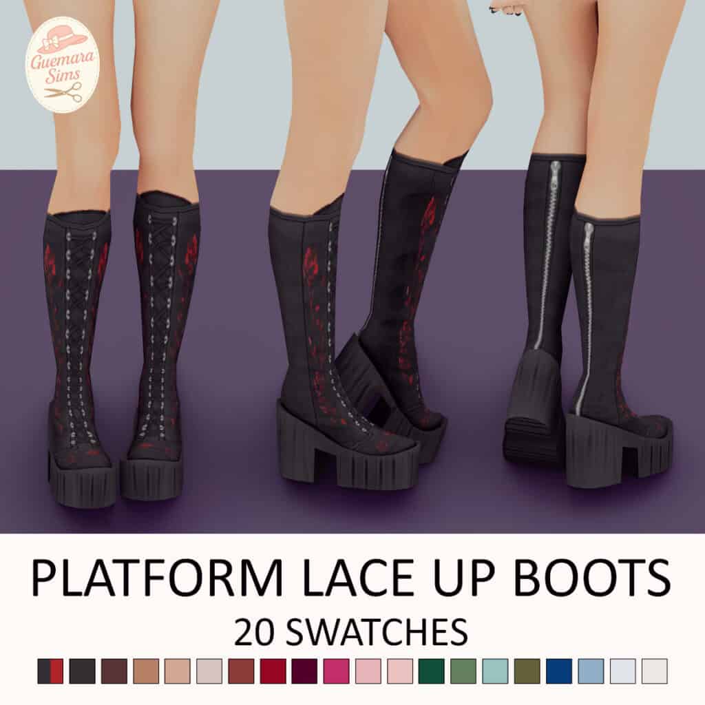 Platform Lace-Up Boots are chunky lace-up platforms with a tall, edgy silhouette, side zippers, and detailed stitching. They’re perfect for creating alternative, punk, or goth Sims.