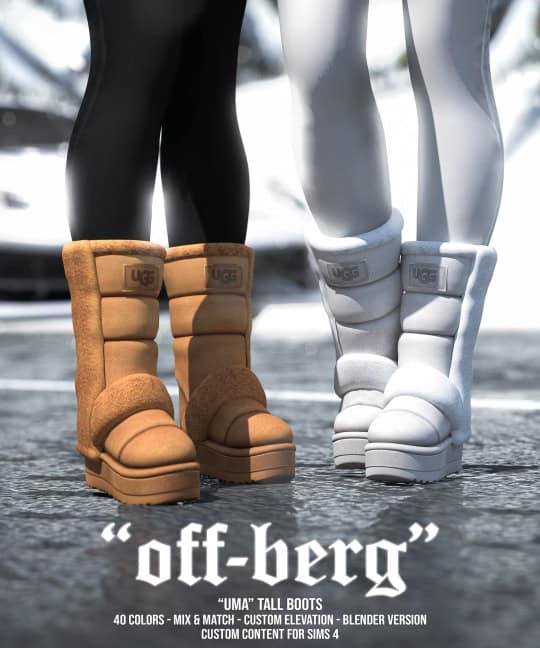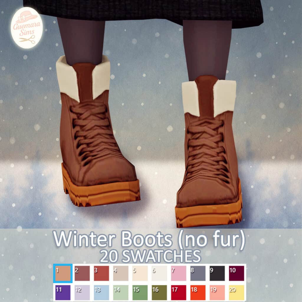 These boots come in 10 colors and are made for female Sims only. They’re compatible with HQ settings, giving you detailed close-up screenshots in CAS. Complete the look with chunky knit sweaters, puffer coats, or leggings for an effortless winter casual vibe.