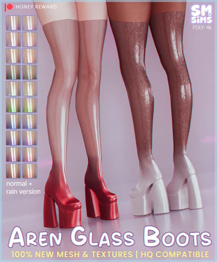If you’re looking for futuristic runway boots, get the Aren Glass Boot. These unforgettable statement pieces are a must-have in 2026. The glass-like heels feature a stunning ombré shine with an optional raindrop-style swatch. This gives your Sims a bold, reflective look that instantly stands out in screenshots.