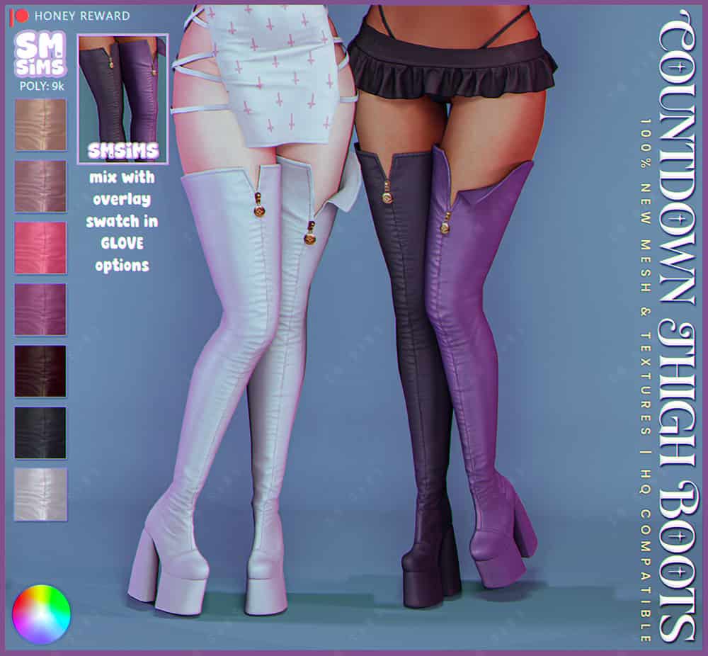 The Countdown Thigh Boots are bold thigh-high boots with sleek zip-front detailing and an auto-leveling fit. This set includes the boots themselves plus an accessory recolor option found under the Gloves category. This gives you extra customization for different outfit moods.