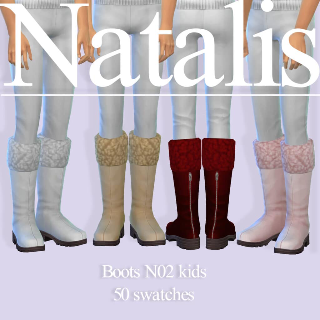 They come in an impressive 50 swatches, offering colors like pink, white, black, and red. The boots are designed for child Sims, and fit seamlessly into feminine-frame wardrobes. They would look super cute paired with puffer jackets, knitted sweaters, or cozy winter dresses.