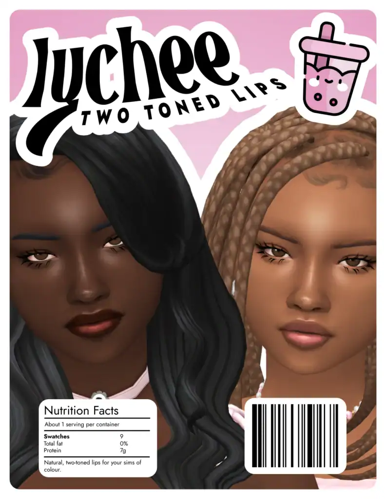 The Lychee Two-Toned Lips is a Sims 4 cc makeup product designed to naturally highlight pigmented, two-toned lips. The maxis match lipstick comes in 9 swatches, and is base game compatible.