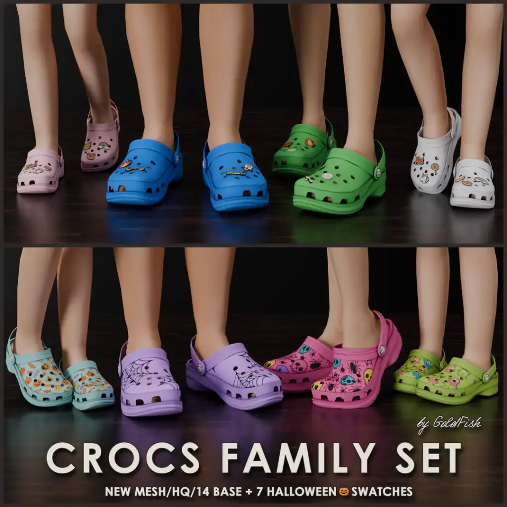 If you’re looking for a fun, all-ages Crocs set for your entire Sim household, the Crocs Family set is a beautiful option. This collection contains multiple Sims 4 crocs cc options in 14 base swatches. Each is decorated with Jibbitz, plus there are 7 Halloween-themed swatches for seasonal outfits.