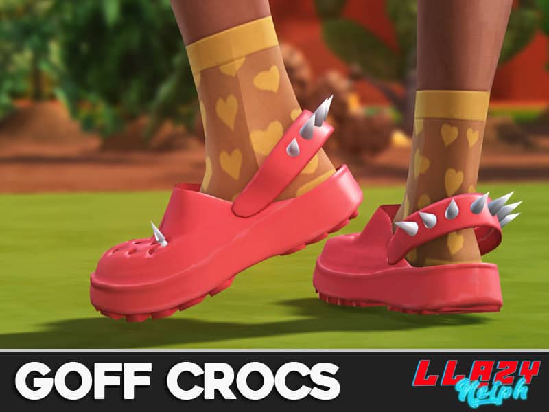 The Goff Crocs are a bold, alternative croc silhouette with a chunky sole and spiked strap details. These Sims 4 crocs cc lean fully into goth-inspired styling. The pair comes in 10 swatches, including standout shades like red and black.