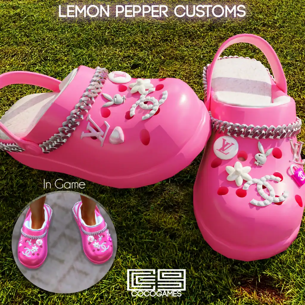 The Lemon Pepper Stepper Customs are playful, charm-covered crocs with a mix of classic and decorated designs. The shoe features a shiny chain running across the top for a stylish touch. This set is base-game and HQ compatible.