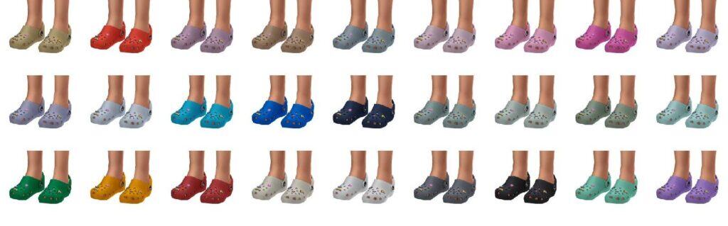 The Sims 4 crocs cc comes in 40 swatches, including bright solids, soft pastels, camo prints, and playful patterned options. You can decorate the crocs with Jibbitz, which come separately, and they’re located in the toenail category. The shoes come in both male and female versions, and they’re HQ compatible.