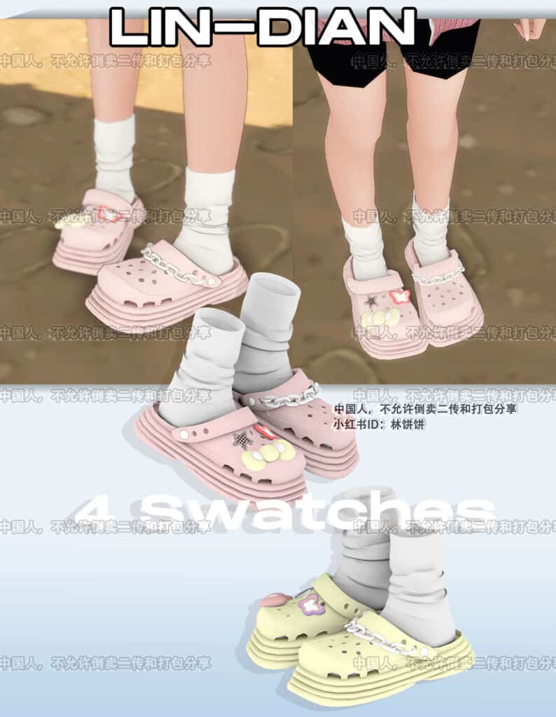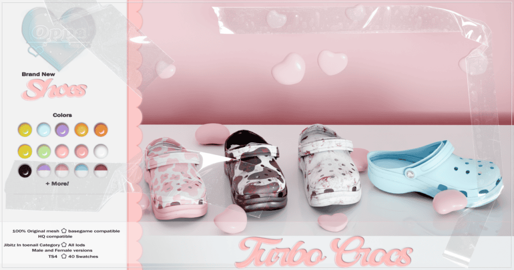Shoestopia – Cute Cute Crocs is a playful, casual footwear option designed for everyday Sims outfits. The shoes come with cute stickers for an added touch of style.