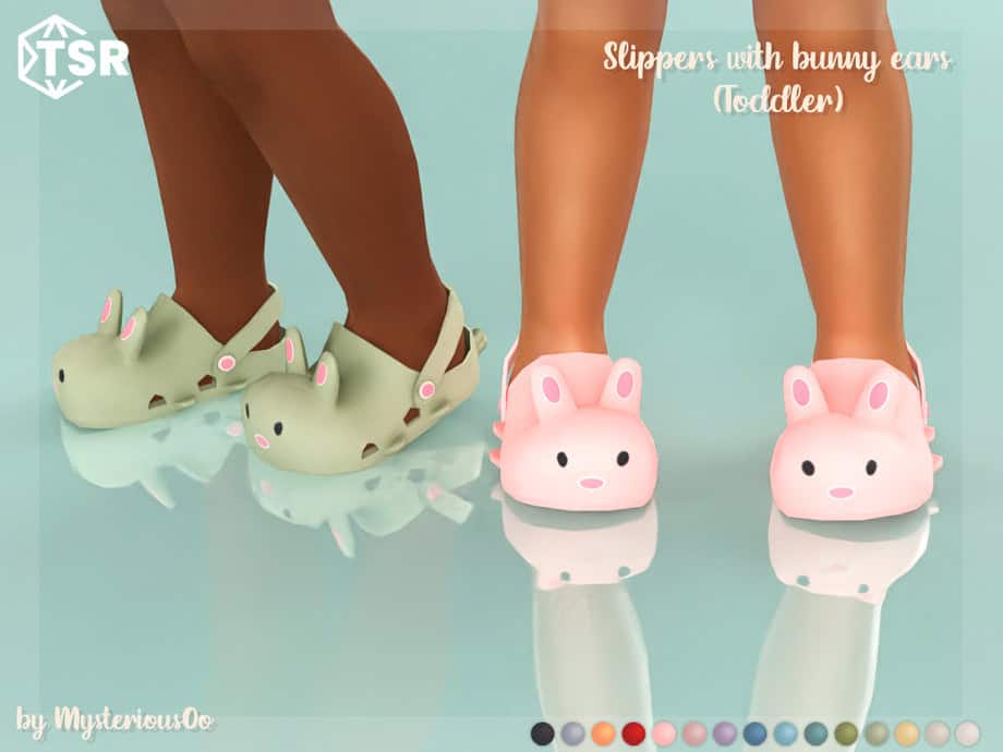 These Slippers with Bunny Ears are an adorable footwear option made specifically for toddler Sims. The design features a soft, rounded slipper shape with cute bunny faces and upright ears at the front.