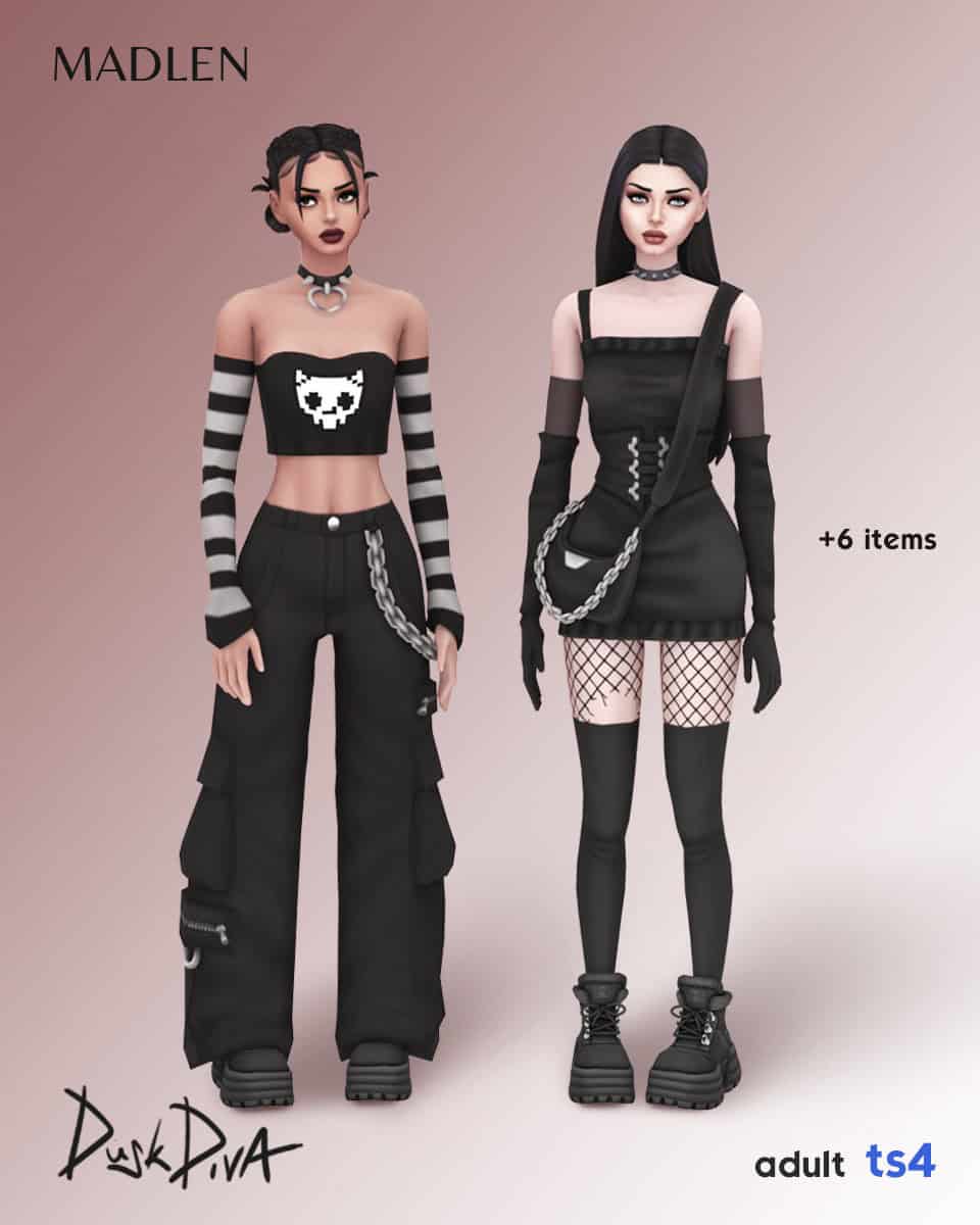 The Dusk Diva 3 set is one of my favorite Sims 4 goth cc collections. It delivers a grunge-meets-goth aesthetic with versatile pieces designed for edgy, modern Sims. The collection includes a mix of tops, skirts, jeans, a dress, and a backpack.