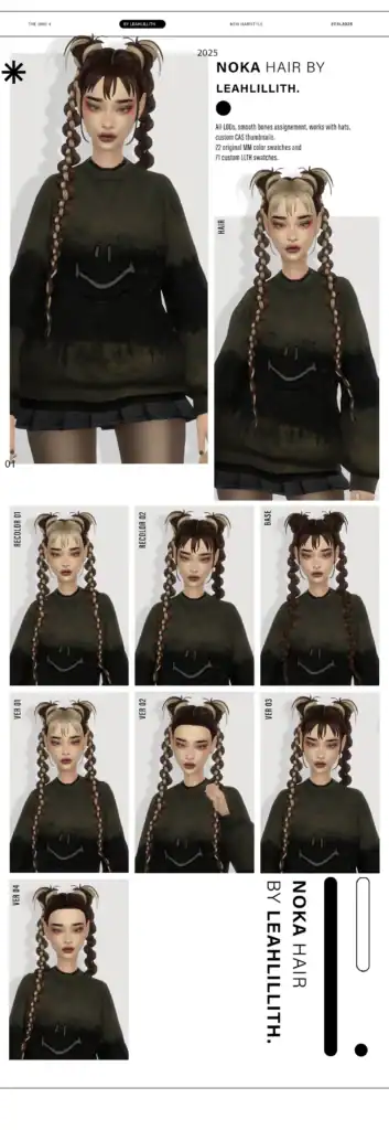 Noka Hairstyle is a playful maxis-match hairstyle with two high buns paired with long braided sections. The style is cute and edgy, which is why I added it to this Sims 4 long hair cc list.