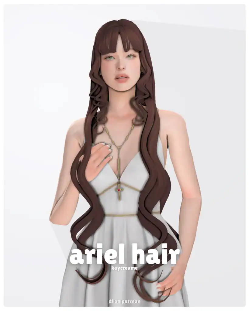 Ariel Hair is a long, flowing hairstyle with soft waves and loose curls framing the face. It’s finished with straight-cut bangs for a romantic, storybook look. The length drapes down the front in defined sections, giving the style an elegant silhouette with gentle movement.