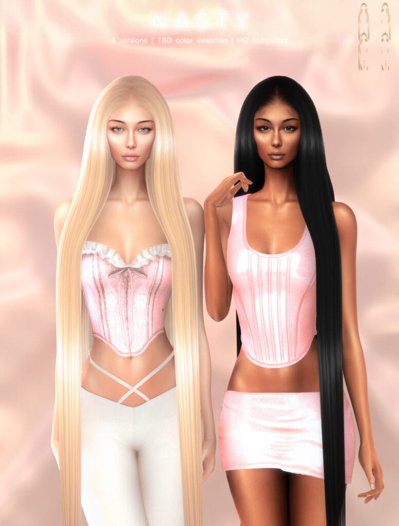 If you’re looking for a super-long, sleek straight hairstyle for your gameplay, get the Nasty Hairstyle. It’s a stunning alpha-style hair with a clean middle part and a smooth, polished finish. The hair falls evenly down the front and back, creating a bold, high-impact silhouette for your female Sims.