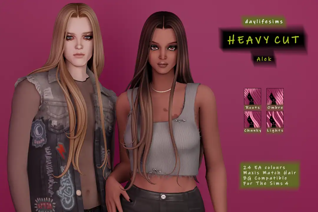 If you’re looking for long, male hair, get the Heavy Cut Set by DayLife Sims. This straight hair is pushed to the front and back and features some loose curly strands at the front for an added touch of elegance. It was originally created for male Sims, but you can also download the female version from the post. The hair comes in 24 EA colors and is compatible with the base game.
